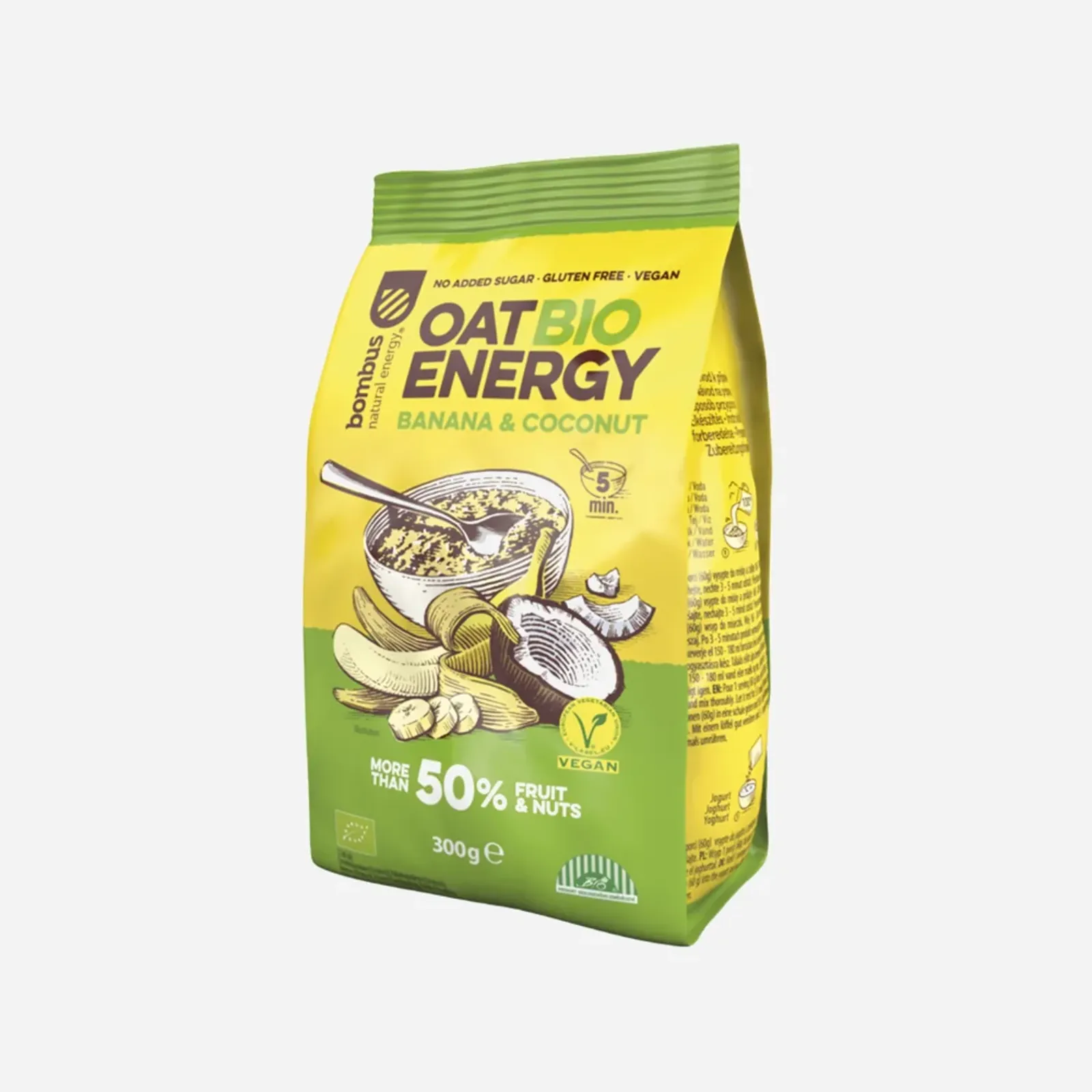 Gluténmentes bio zabkása a cseh Bombus márka Oat Bio Energy termékcsaládjából. Ez a zabkása több mint 50% gyümölcsöt és dióféléket tartalmaz, és egyesíti a banán és a kókusz bevált ízét.