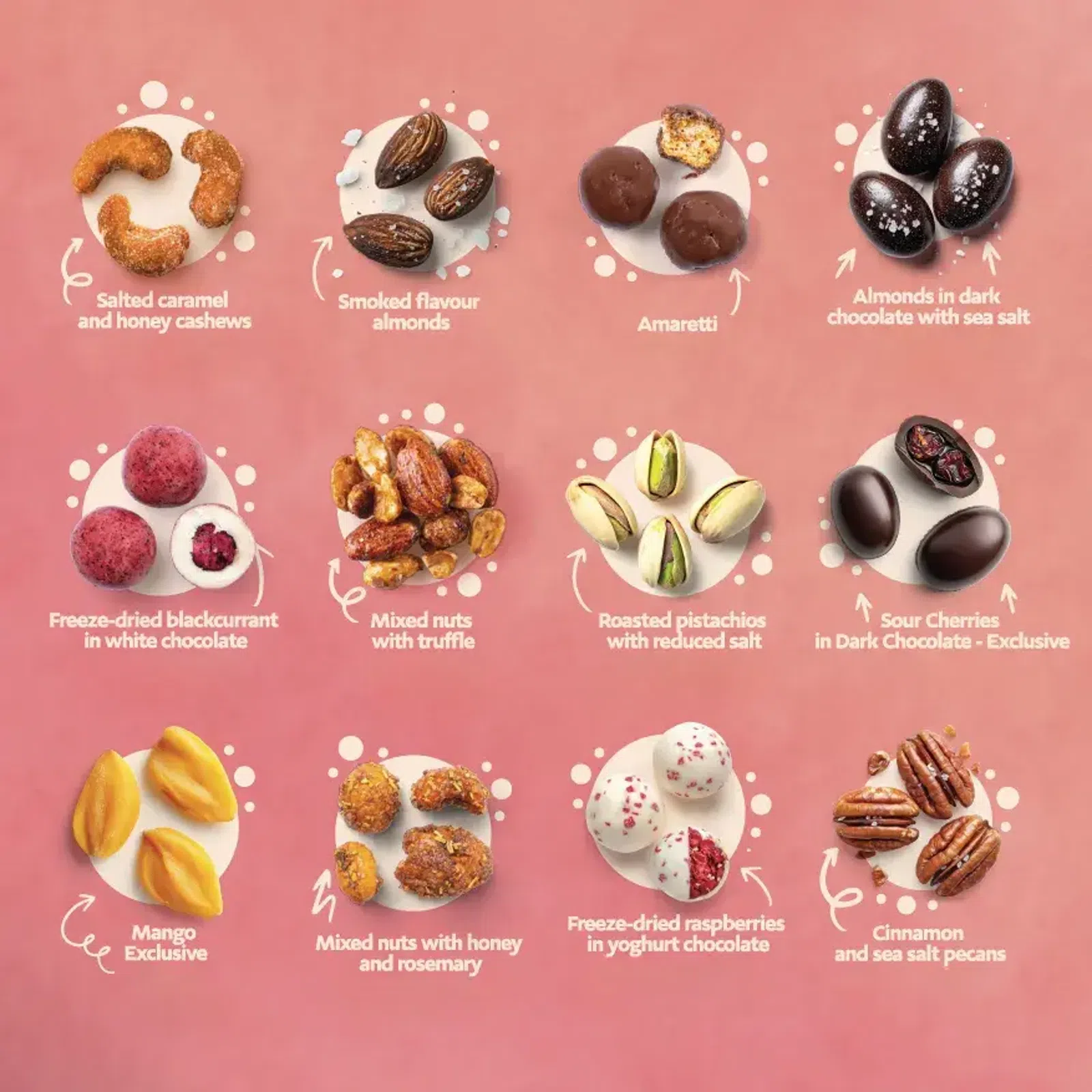 Az ajándékdoboz finom kombinációkat tartalmaz, mint például sós karamellás kesudió, pirított pisztácia, füstölt aromájú mandula és más ínyencségek. Az édesszájúakat elbűvölik a meggyek étcsokoládéban, a liofilizált ribizli csokoládéban, vagy a finom Amaretti sütemények. Az eredeti ízkombinációkat pekándió fahéjjal, mango exclusive és szarvasgomba ízű diókeverék egészíti ki.