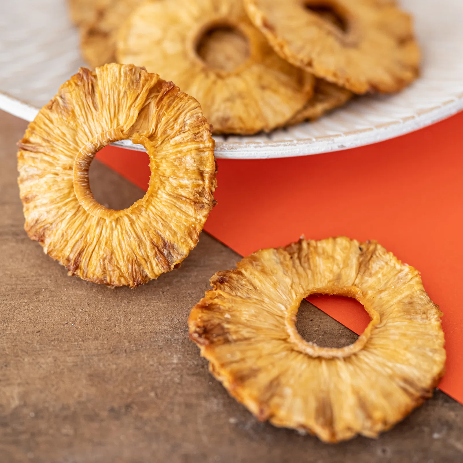 A finom, édes ananászkarikákba azonnal beleszeretsz. És várj csak, amíg megkóstolod, milyen az ízük! Utána biztosan nem akarsz majd lemondani róluk. Nem kell aggódnod, mert a szárított ananászkarikák 100%-ban természetesek. Összetételükben nincs hozzáadott cukor, kén-dioxid vagy adalékanyag. Amint beleharapsz, a nyelveden érzed a lágy, édes gyümölcshúst, és csapdába esel – egy csodás ananászcsapdába. Miért is ne? A nassoláson kívül díszítheted vele a reggeli kásádat, joghurtodat vagy müzlit is. Tökéletes, gyorsan elkészíthető nasi, ha munkába, iskolába vagy kirándulásra indulsz.
