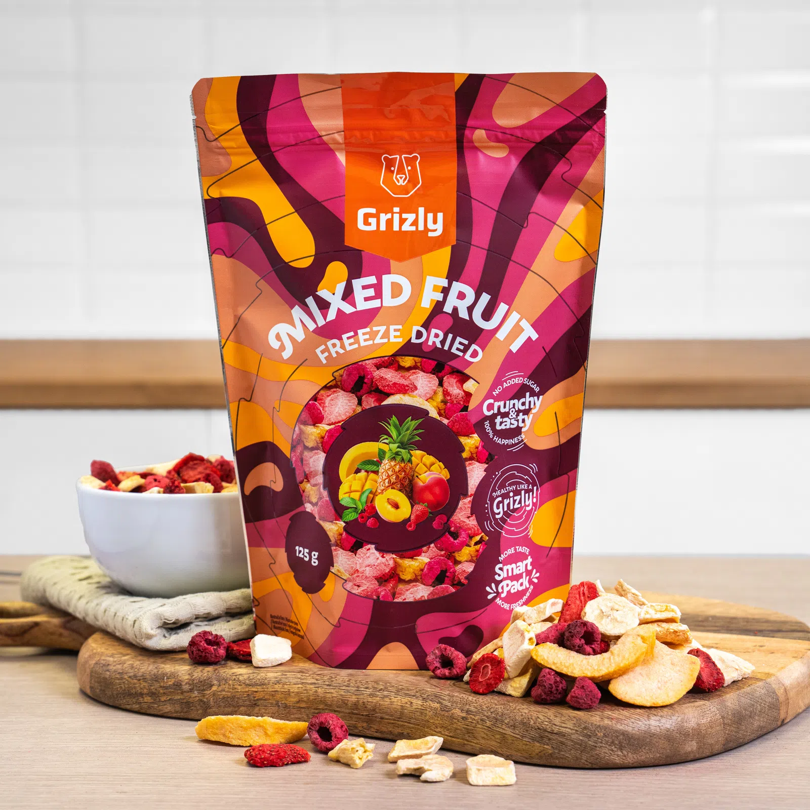 A fagyasztva szárított gyümölcsök változatos keveréke epret és málnát tartalmaz, banánszeletekkel, ananász-, őszibarack- és mangódarabokkal kiegészítve. Öröm az ízlelőbimbóinak.