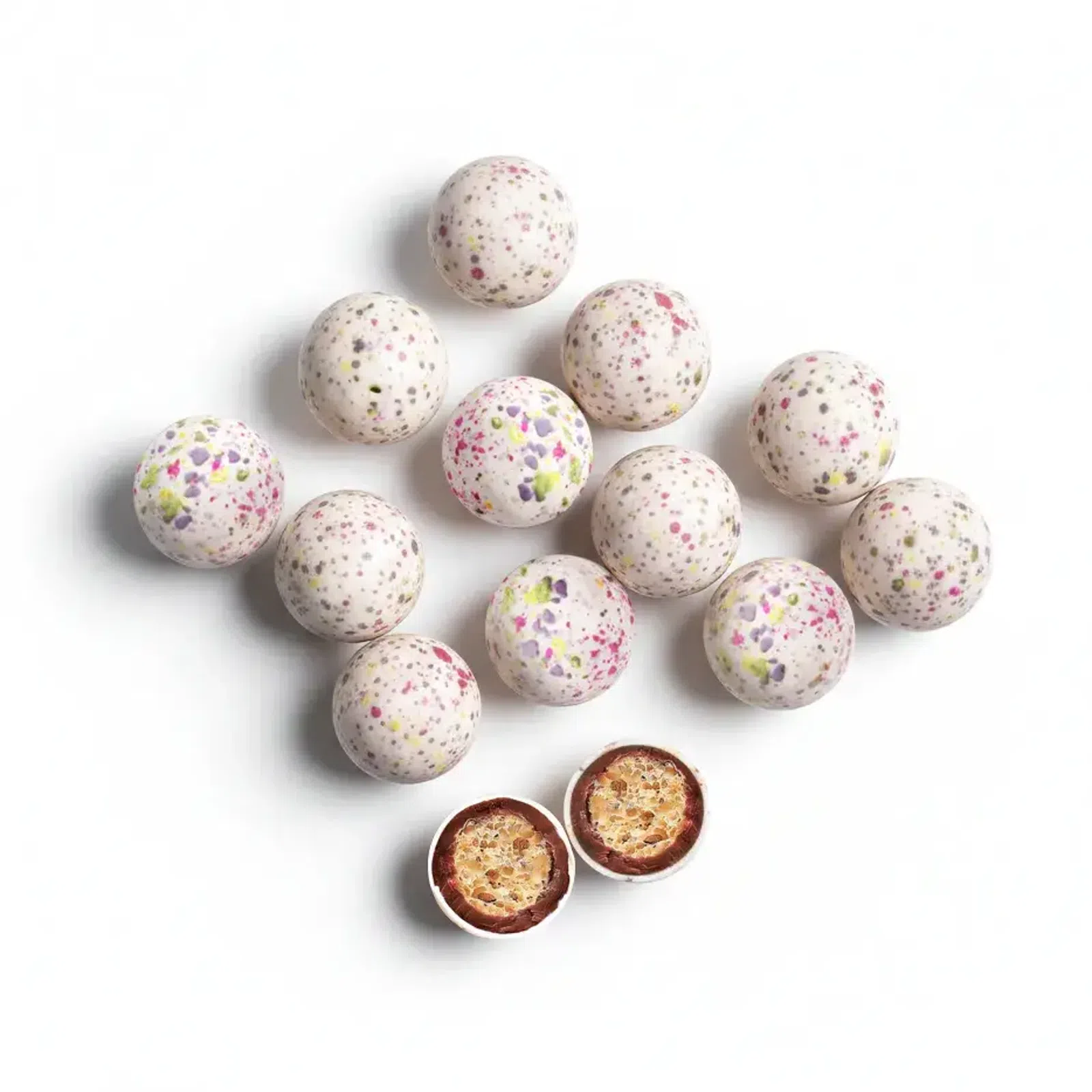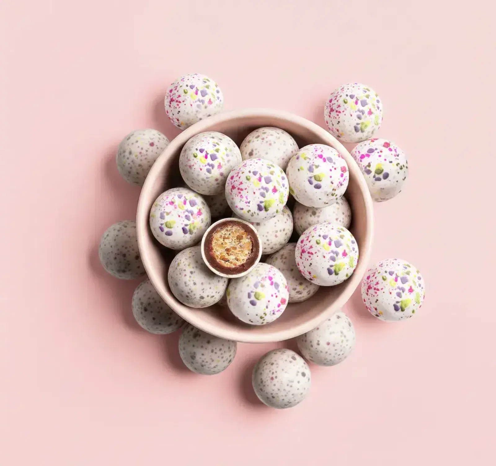 Apró golyócskák tele tavaszi hangulattal és örömmel. A húsvéti ropogós drazsé belsejében könnyed roppanó réteg rejtőzik, amelyet gazdag tejcsokoládé és kemény cukorbevonat véd. Minden egyes golyó a tavasz színeiben pompázik, és tökéletes egyensúlyt kínál a ropogósság és a csokoládé lágysága között. Ideális húsvéti ajándék locsolóknak, édes dekoráció az ünnepi asztalra és vidám nassolnivaló otthonra. Mert a húsvét akkor a legfinomabb, ha színes és ropogós.