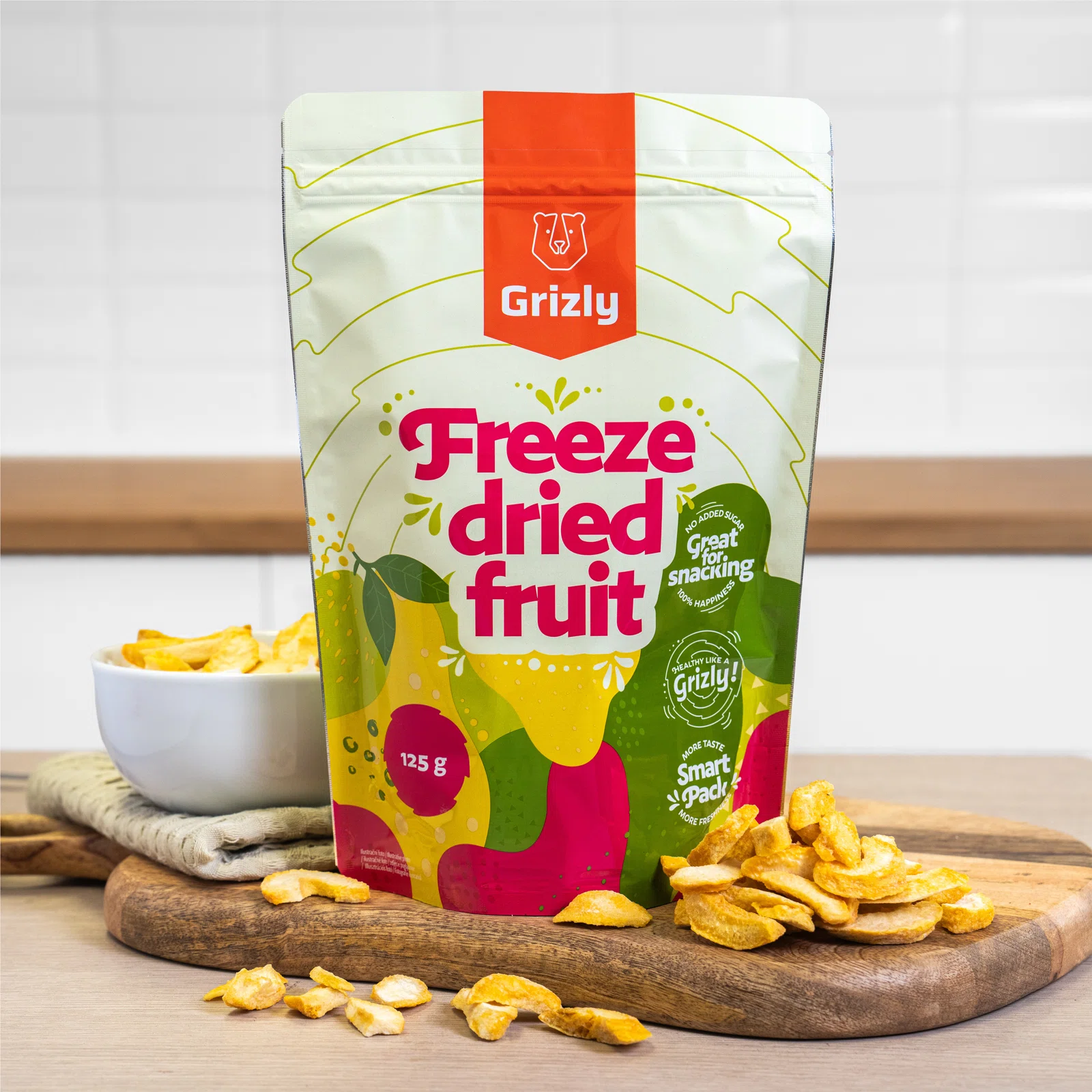 A GRIZLY fagyasztva szárított őszibarack nagyobb kiszerelésben is élvezhető, köszönhetően a visszazárható csomagolásnak, amely ropogósan és frissen tartja.