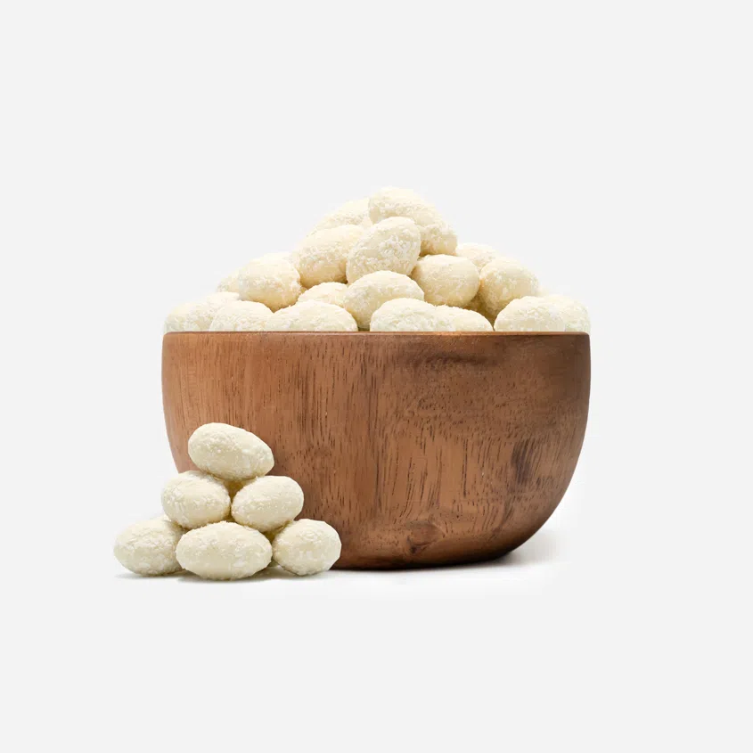 Élvezd a finom mandula és a lágy fehér csokoládé találkozását ropogós kókuszdarabokkal.