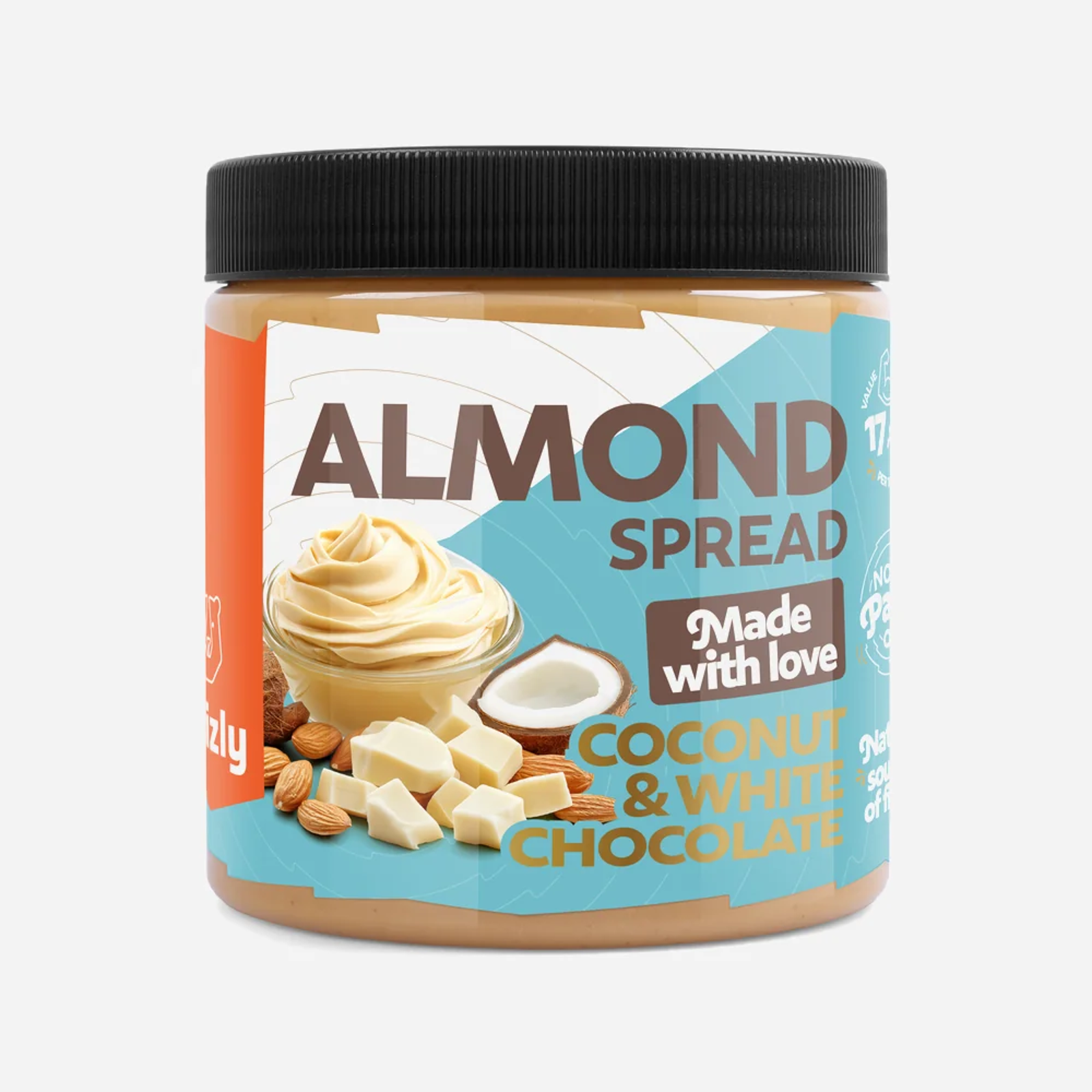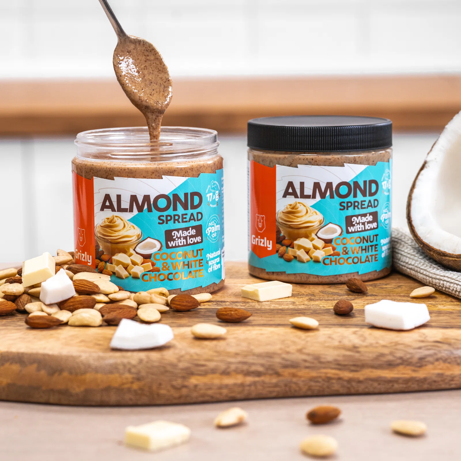 GRIZLY Mandulavaj kókuszdióval és fehér csokoládéval - az egyik legsikeresebb grizzly vaj - a mandula, a kókusz és a fehér csokoládé krémje egy álomkombináció.