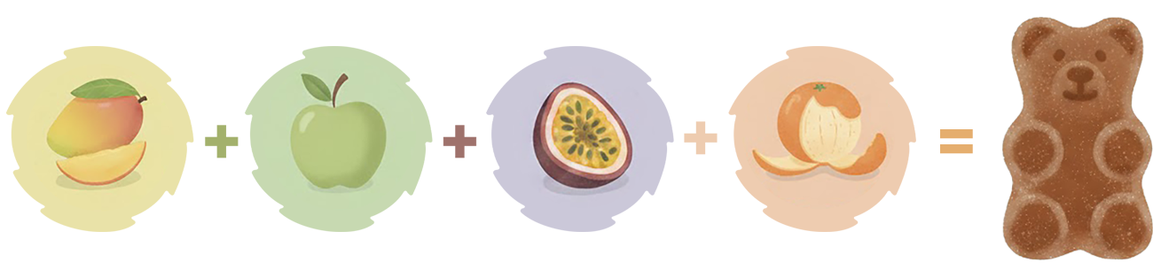 Almalé, mangópüré, almaszósz, maracujalé és narancslé. Együtt a friss gyümölcsös jegyek igazi robbanását adják, amely azonnal egy trópusi paradicsomba repít. Minden falat egy apró ízfesztivál, amely felébreszti az ízlelőbimbóidat. Ha valami édesre vágysz, nyúlj ezekhez a mangós macikhoz, és élvezd a bűntudatmentes örömöt.
