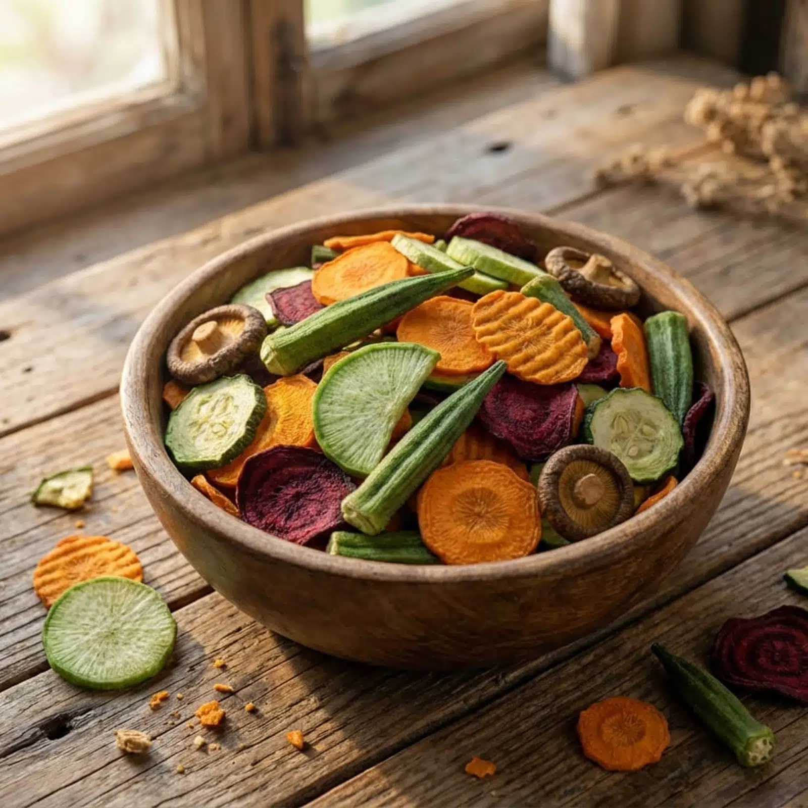 Őszinte íz zöld retekből, sárgarépából, céklából, okrából és gombából ropogós formában