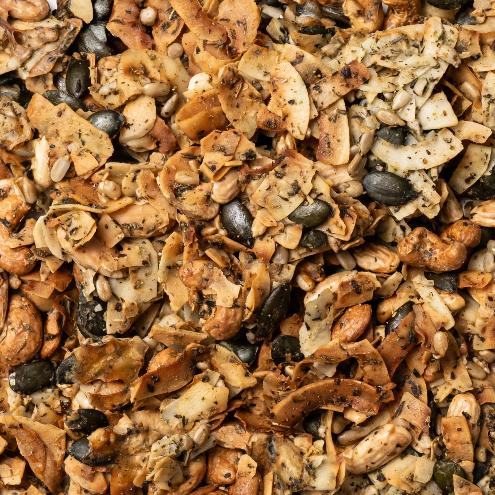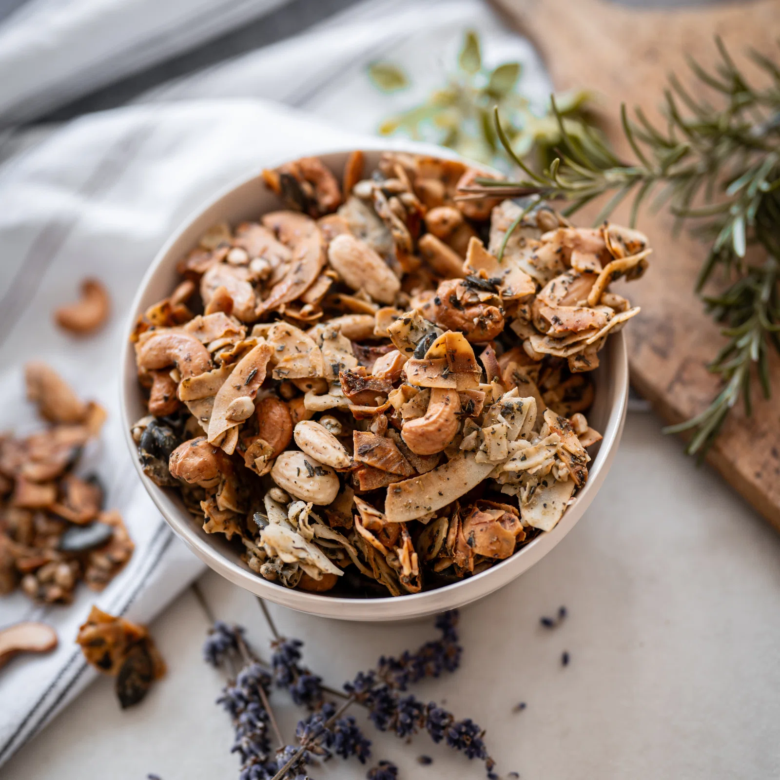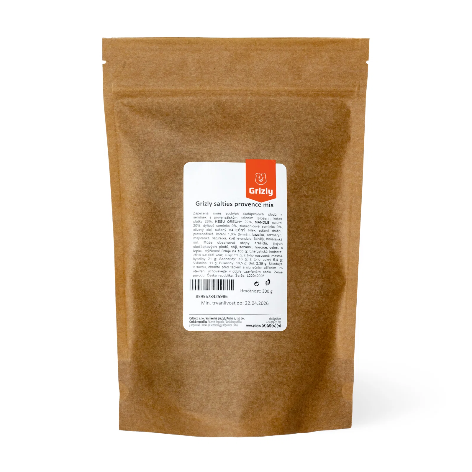 A klasszikus provanszi fűszereken kívül a mix kesudióból, mandulából, tökmagból, kókuszcsipszből, olívaolajból és egy csipetnyi himalája sóból készült. Tökéletes választás nassolásra vagy vendégváró falatnak.