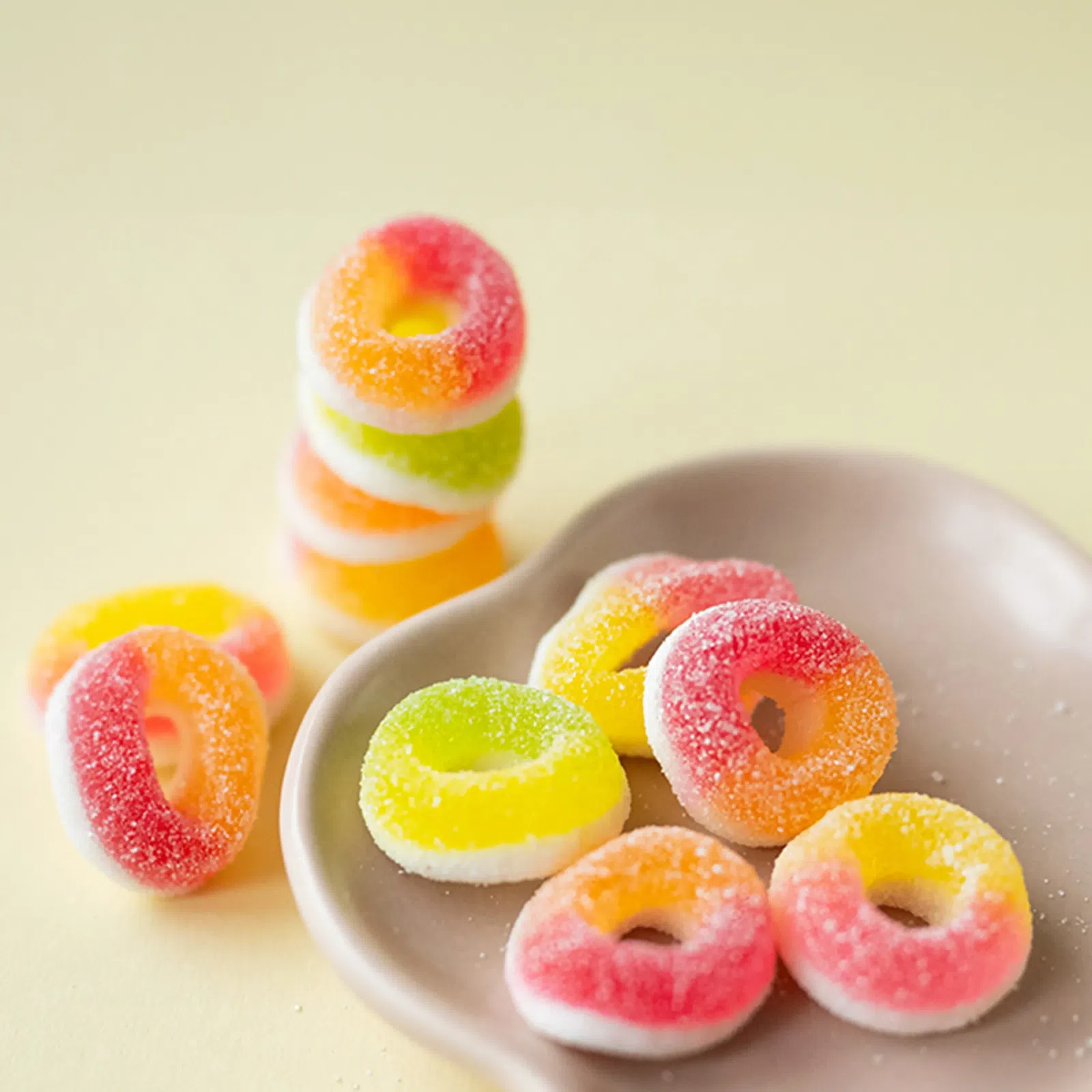 Czasem ma się ochotę na coś innego niż słodkie — i bardzo dobrze! Zamiast po słodycze, sięgnij po coś bardziej kwaskowatego. Co ty na to? Te żelki o owocowym smaku mogą idealnie zaspokoić twoją ochotę. Kółeczka łączą w sobie żelkę i piankę, a do tego są obtoczone w kwaśnej posypce, więc dają perfekcyjną równowagę smaków. Mamy sześć owocowych smaków: ananas, jabłko, wiśnia, pomarańcza, malina i cytryna.