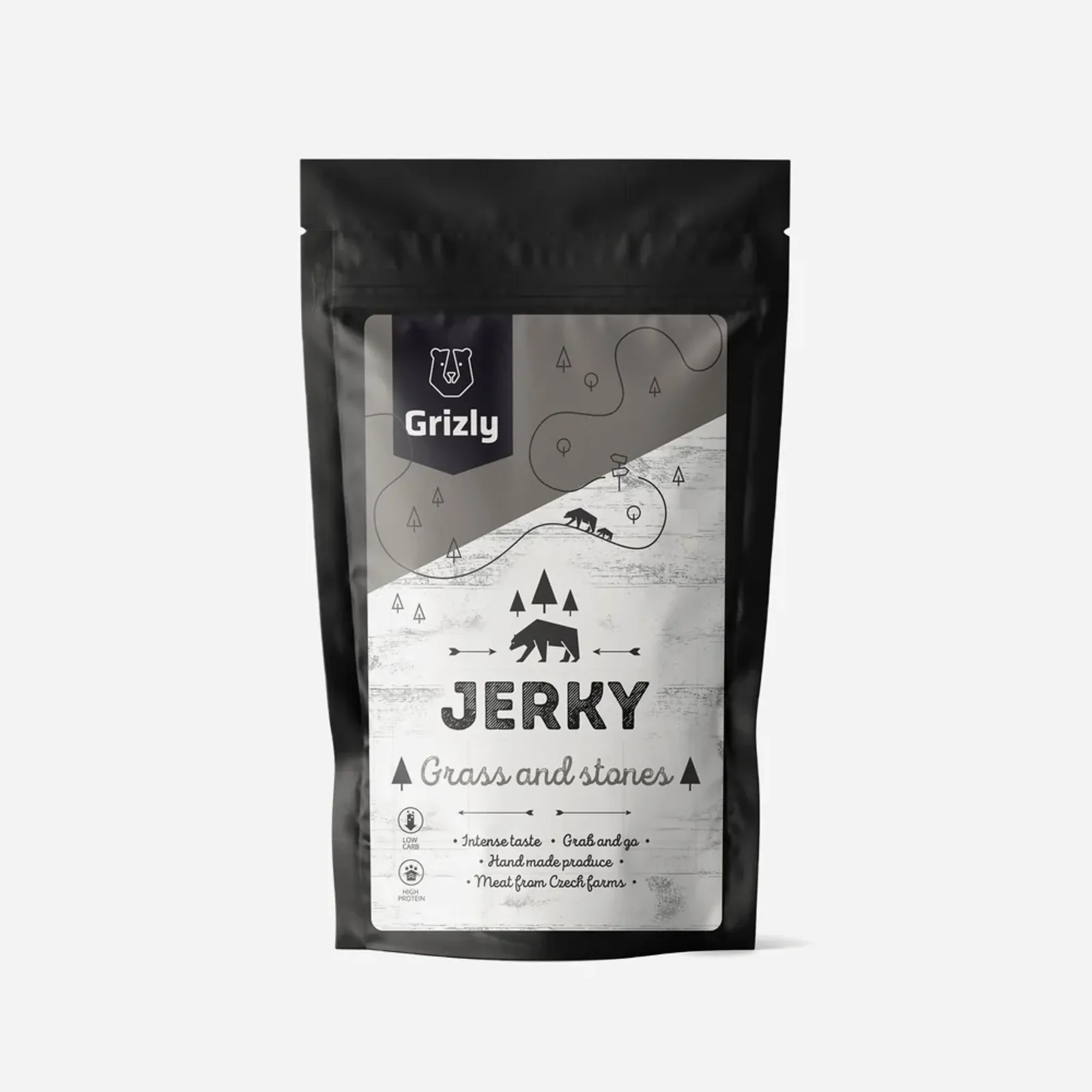 GRIZLY szárított hús fű és kövek, ez a megfelelő snack tele fehérjével és finom eredeti ízzel, vegyszerek használata nélkül készült, utazásra alkalmas csomagolásban.