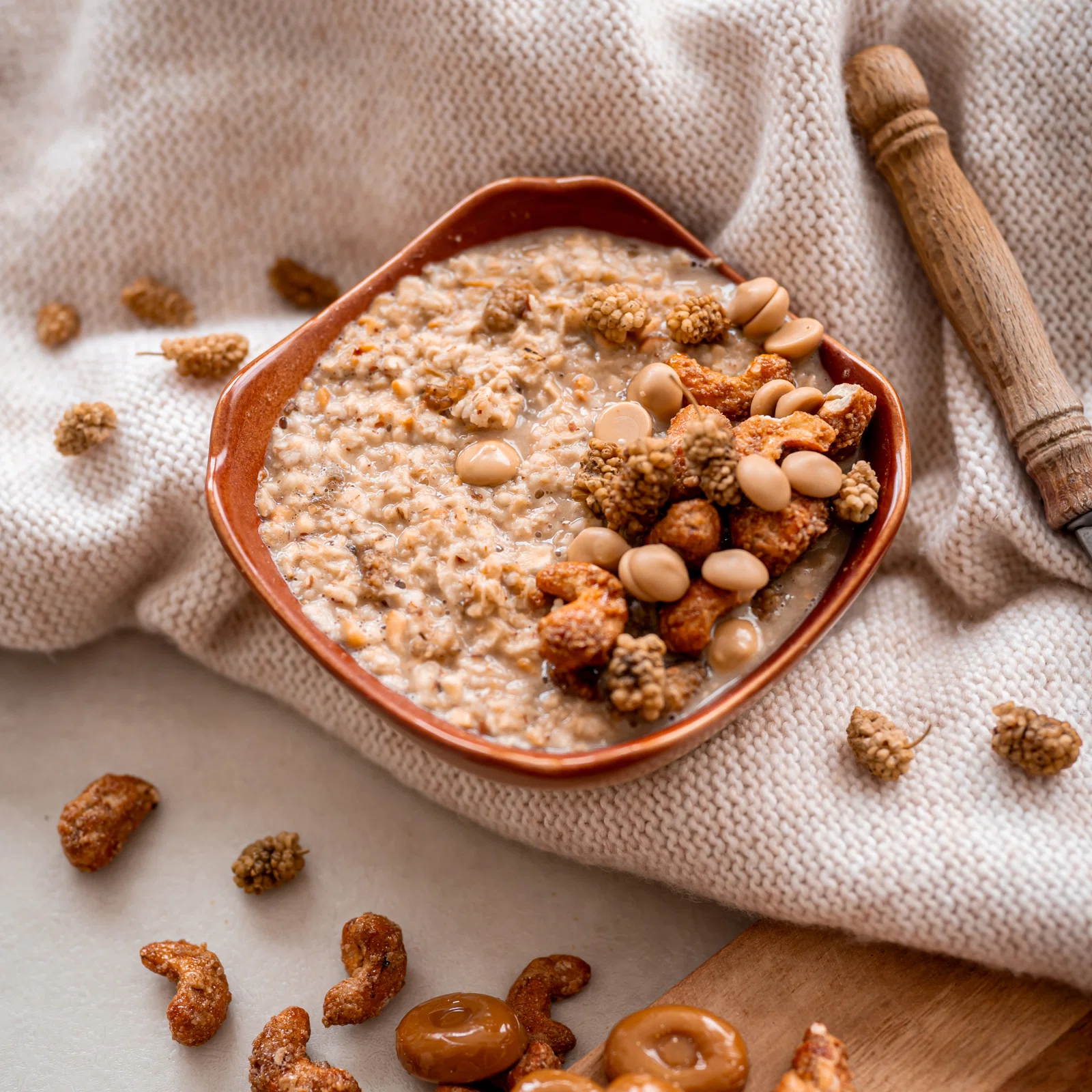 Ahogy mindig – csak a legjobb összetevőkből! A finom belga fehér csokoládét karamellel és szárított fehér eperfát csíráztatott gluténmentes zabpehely egészíti ki, amely könnyebben emészthető, mint a hagyományos szemek. A zabkásában sós karamellás kesudió- és manduladarabkák is találhatók.