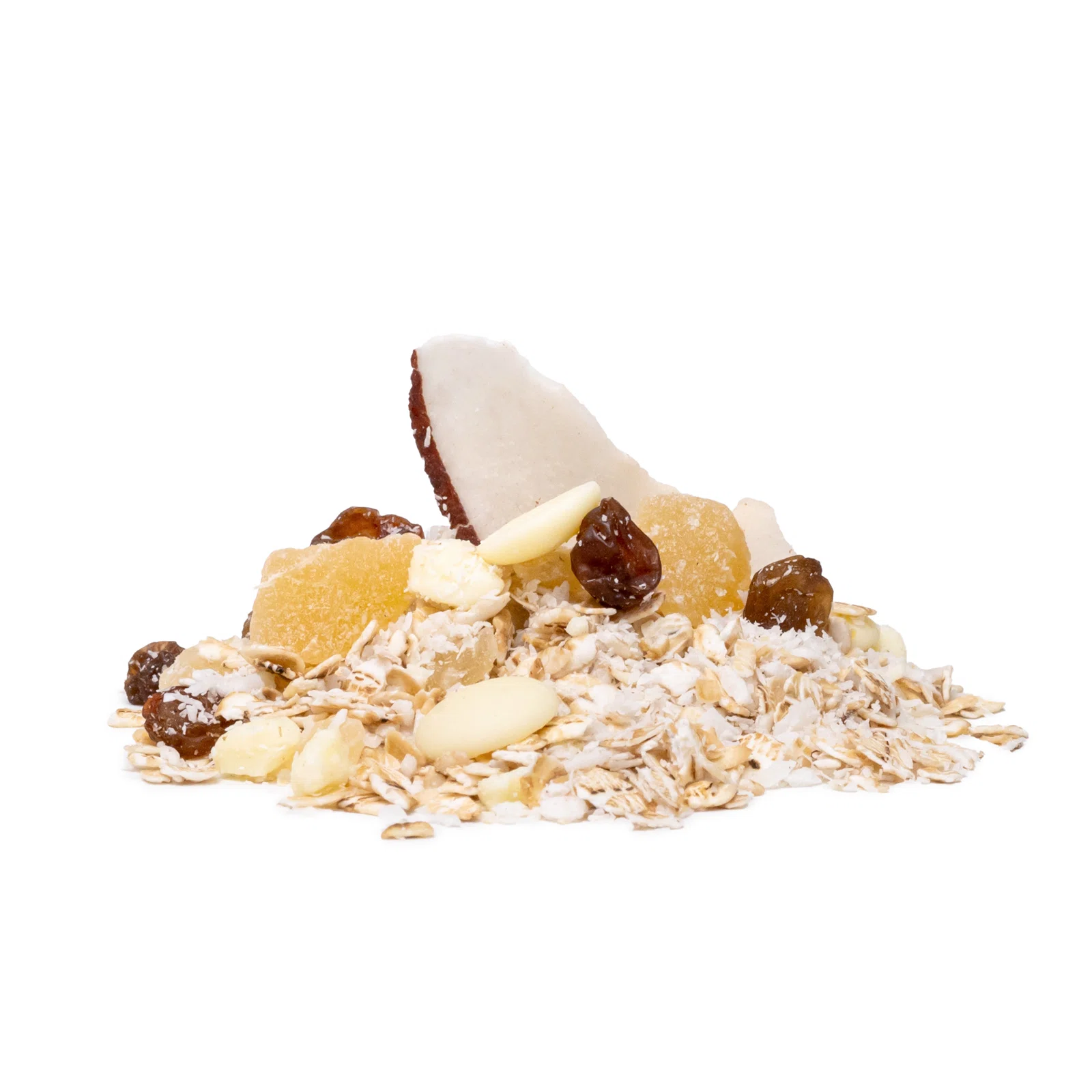 | Összetevők: | gluténmentes zabpehely csírával 38 %, reszelt kókusz 25 %, belga fehér csokoládé (cukor, kakaóvaj, sovány tejpor, emulgeálószer: szójalecitin; természetes vanília aroma), aranymazsola (mazsola 99,7 %, napraforgóolaj), ananászkockák 8 % (ananász 51 %, cukor, savanyúságot szabályozó anyag: citromsav; tartósítószer: kén-dioxid). |