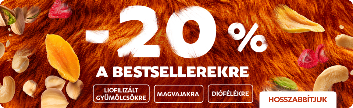 Minden finomság a „Bestsellerek akciós áron” kategóriából 20% kedvezménnyel kapható ezzel a kuponkóddal:
